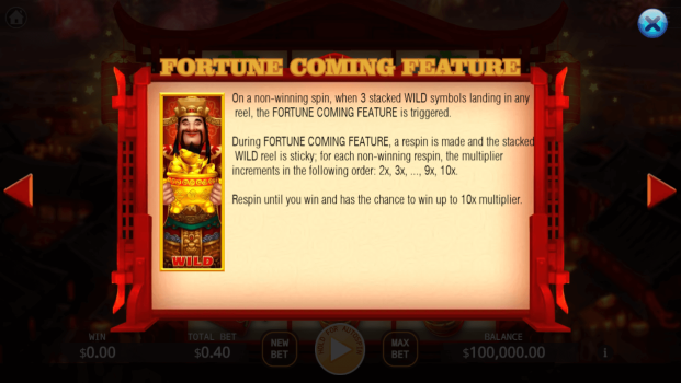 - Fortune Coming: ในช่วงฟีเจอร์นี้ จะมีการหมุนซ้ำ และรีล Wildที่เรียงซ้อนกันจะเหนียว สำหรับการหมุนซ้ำแต่ละครั้งที่ไม่ชนะ ตัวคูณจะเพิ่มขึ้นตามลำดับต่อไปนี้: 2x, 3x, 9x, 10x และจะหมุนซ้ำจนกว่าคุณจะชนะ และมีโอกาสชนะตัวคูณมากถึง 10 เท่า