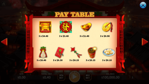 - สัญลักษณ์อักษรจีน : เรียง 3 สัญลักษณ์ จะได้รับรางวัล 3.40x เท่าของเงินเดิมพัน
